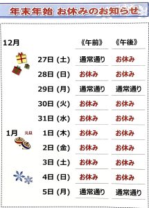 今年の年末年始のお休みはこちらになります。 よろしくお願いいたします。 <img class="alignnone size-medium wp-image-3183" src="https://sumisan.co/wp-content/uploads/2025/12/IMG_E05681-215x300.jpg" alt="" width="215" height="300" />
